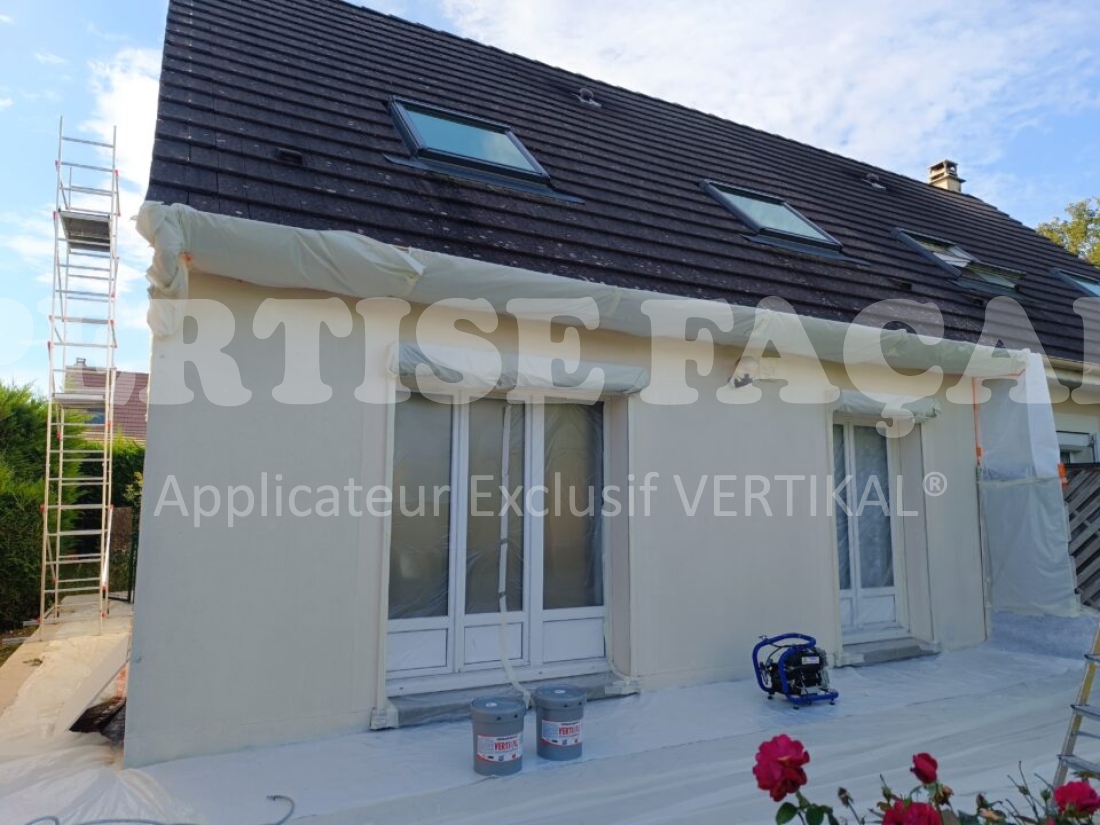 Enfin, pour finaliser notre rénovation sur Othis, ville située dans le nord du 77, nous avons appliqué un Revêtement Epais Structuré le VERTIQUARTZ PRO PG 50. C’est un revêtement riche en résines qui va éviter le retour des micro fissures.